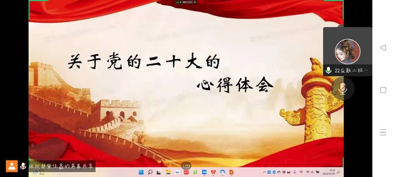座谈会总体分为两个环节。第一环节,主持人播放中华人民共和国国歌并展示歌词和习近平总书记金句,在国歌的余韵中,主持人带领大家简要回顾习近平总书记在二十大会议上的精彩发言,其中,习近平总书记的陈词铿锵有力,他对全党同志的殷嘱和对建成新时代中国特色社会主义的决心鼓舞着观众;第二环节,2021级和2022级部分团支书依次发表对二十大的心得体会,发言者畅所欲言,体现自己对二十大和新时代的思考和感悟,以及各自从中学到的优秀思想和精神。通过这些同学的精彩发言,在座学生都更加了解党的二十大精神,坚定了为把我国建设成社会主义现代化强国而奋斗的信念。最后,主持人对本次座谈会进行总结,引导大家传承红色基因,争做新时代四有青年,在二十大光辉的指引下,踔厉奋发、笃行不殆,一步一个脚印,永远跟党走。