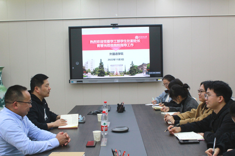 为深入了解学院学生工作的开展情况及学生培养质量,加强学院辅导员队伍建设,推动疫情期间辅导员工作的有序进行,11月3日下午,外国语学院邀请党委学工部副部长、学生中心副主任蒋晋光老师参加学院辅导员工作推进会。学院党委副书记曹崇,全体专兼职辅导员老师参加了本次会议,会议由院党委副书记曹崇主持。