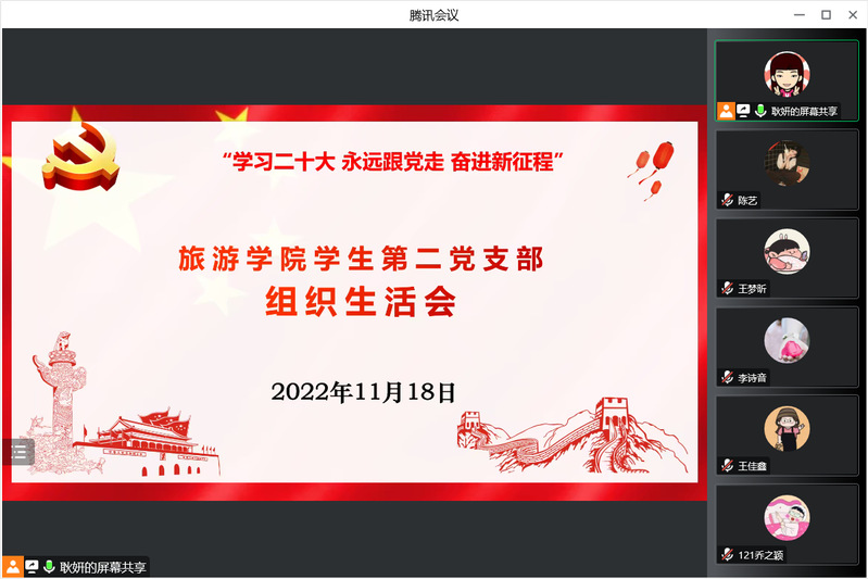 为加强学生党员的党性修养,提升组织凝聚力,11月18日下午,旅游学院于线上开展学生第二党支部组织生活会。会议由旅游学院学生第二党支部书记耿妍主讲,全体学生党员参加。