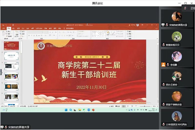 为提高学生干部的业务水平和整体素质,培养创新型、复合型和协作型优秀人才,提升其公文撰写能力和摄影技巧,11月30日晚,商学院于线上举办团学骨干技能培训暨经验交流会。相关负责人及2022级全体学生干部参加此次活动。