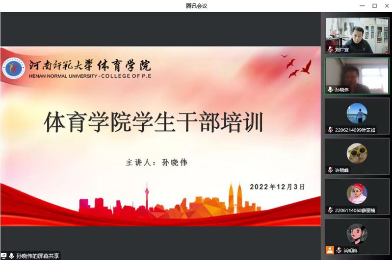 培训会邀请商丘师范学院艺术设计学院党委副书记孙晓伟线上做了题为《大学生修身养性之主体性建构与人生境界---学生干部领导力与执行力实践论》专题讲座。培训会上,孙晓伟老师与同学们热情互动,谈人生、谈理想、谈学习,语言妙趣横生,分享了提升学生干部管理能力的重要作用等一系列知识,勉励广大学生干部要不断提升个人的综合素养,在自己的岗位上各司其职、尽心尽力,充分展现当代大学生干部的良好精神面貌。