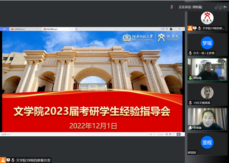 2023年硕士研究生入学考试在即,为进一步提高文学院学生的考研热情,帮助大家把握好冲刺阶段复习的重点与难点,做好冲刺阶段的心理调适,12月1日晚,文学院2019级兼职辅导员李雨璇通过腾讯会议为学院考研学子开展了考研冲刺阶段经验交流会。2019级辅导员荆恒磊及学院全体考研学生参加了此次会议。