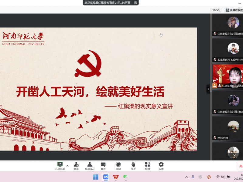 为进一步学习贯彻习近平总书记在河南安阳考察时的重要讲话精神,理解红旗渠的现实意义,生命科学学院红旗渠精神实践宣讲团于12月31日线上开展“开凿人工天河,绘就美好生活”主题宣讲活动,学生70余人参与活动。