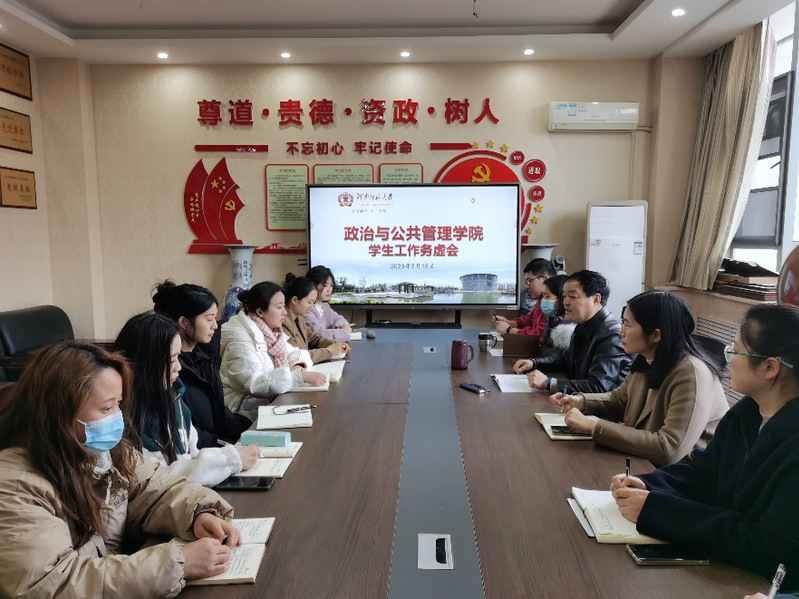 2月15日下午,政治与公共管理学院于办公楼214室召开学生工作务虚会,学院党委书记赵红杰、副书记张瑾及各年级专兼职辅导员参加会议。