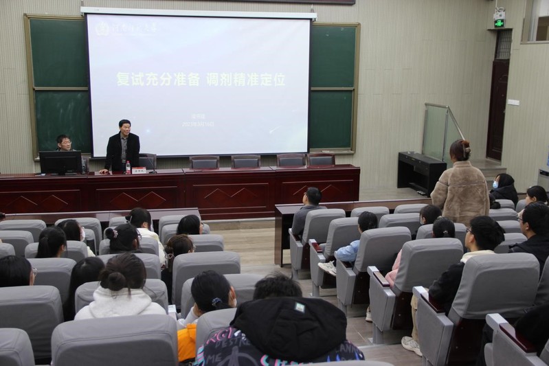 讲座中,梁书斌结合多年研究生招生工作经验,以“复试充分准备,调剂精准定位”为主题,围绕研究生招生政策、研究生复试准备、调剂学校与专业选择等内容,通过对应的具体案例进行全面细致讲解,并强调了三部分内容:“考研及早着手,周密计划;复试借鉴经验,敢于创新;心态平和,巧妙调剂”。他鼓励学生复试及调剂要树立信心、强化演练、突出亮点、规避不足、精心准备。他强调,学生在夯实基础的同时要合理利用资源,做出正确有效的选择,以良好心态参加研究生复试与调剂工作,并预祝考研学生成功“上岸”。讲座末尾,与会师生进行互动交流,主讲人对学生提出的问题和疑惑进行了一一解答和耐心指导。