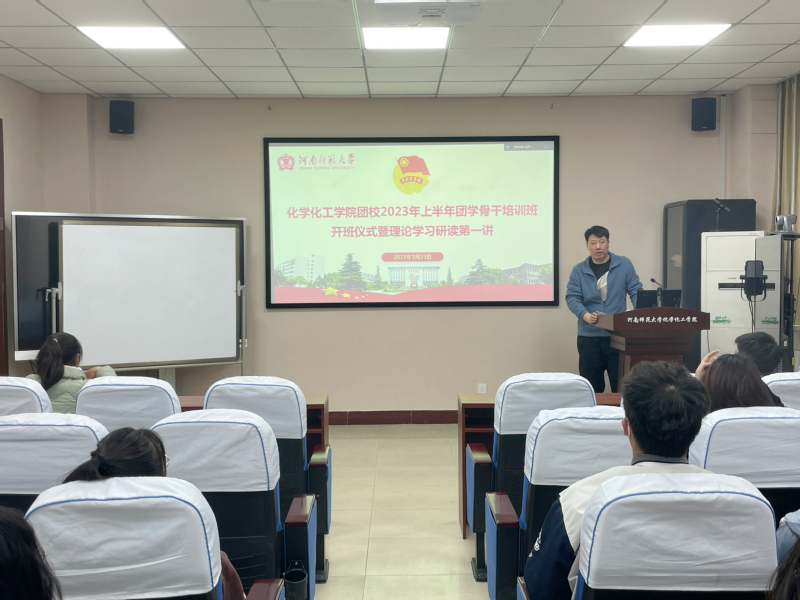 为加强组织理论学习,完善团学骨干培训制度,推动团学工作顺利开展,3月23日中午,化学化工学院二级团校2023年上半年团学骨干部培训班暨理论学习研读班第一讲于化学北楼N102会议室顺利开展。本次的会议采用线上线下结合的方式,由团委学生副书记任泓旭主讲,团委书记曹锟出席会议。