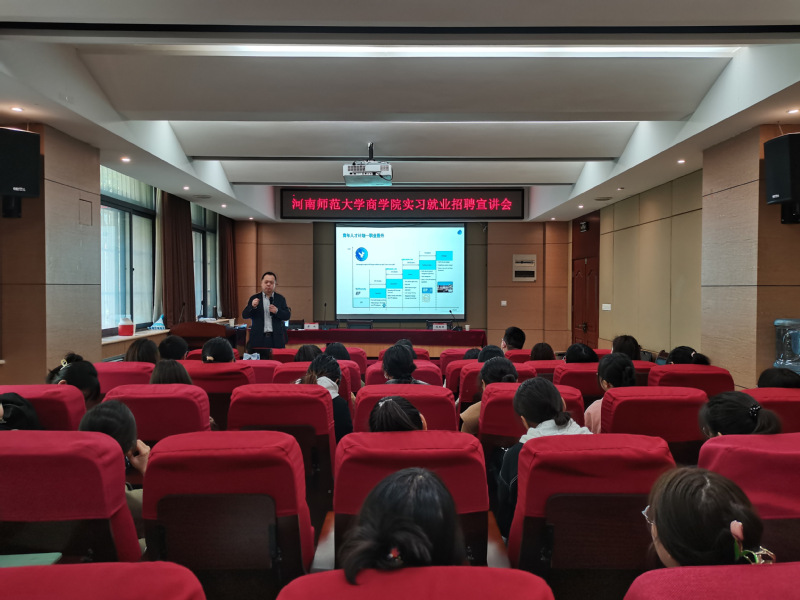 为促进毕业生高质量就业,促进校企深度融合,帮助学生提高择业就业能力,4月7日上午,商学院于学院119报告厅举办河南人才集团产教一体研究院专场实习就业招聘宣讲会。河南人才集团产教一体研究院总经理王兰,校企事业总经理梁冰,业务经理焦笛、马龙斌莅临我院做就业指导工作,学院相关负责人及部分2024届毕业生积极参加本次活动。