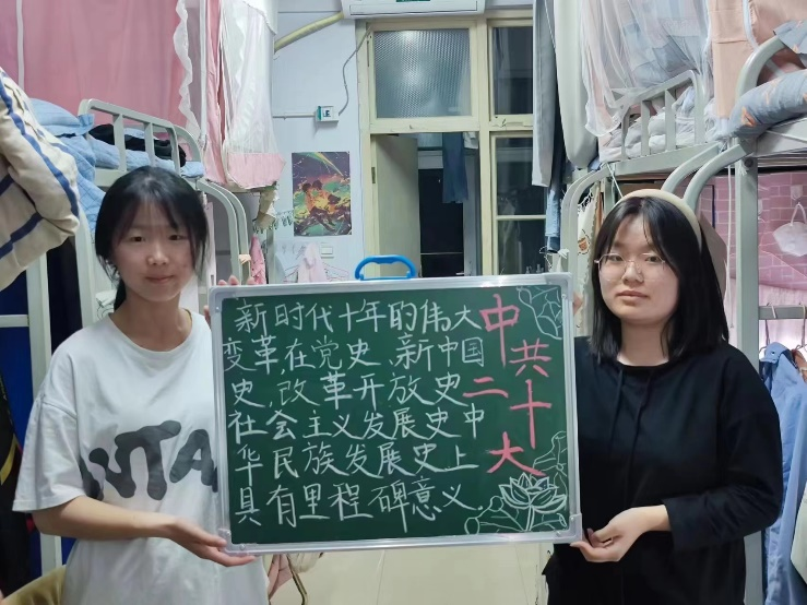 本次活动,同学们积极参与,各展风采,完成情况良好。其中,东寓12号楼301宿舍主题鲜明,内容详实,指出了二十大对现代化建设的重要意义并呼应当代青年以青春之名,践行青春时刻。304宿舍图文并茂的展现出活动主题,聚焦“奋斗”与“实干”二词,不忘时代殷殷嘱托,以青春之姿砥砺前行,在实践中磨砺自我。308寝室的小黑板粉笔字整洁工整且以花朵作为背景点缀,整体效果甚好。同学们以宿舍为单位认真学习党建知识,精心准备小黑板内容,彰显出青年端正负责的态度及积极进取的精神风貌,抒写出对党和国家的忠诚与热爱。