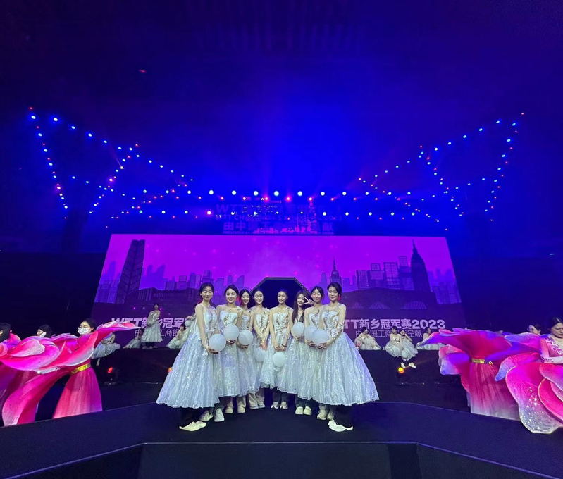 活动开始前期,学院舞蹈编导专业师生积极组建舞蹈队伍,精心组织排练,严格按照大赛组委会相关要求准备演出事宜。大赛开幕式在序曲《用乒乓连接世界》中拉开序幕,在全场黑幕下,一个个白色透亮的灯球好似一颗颗灵动的乒乓球,自由跳动着,韵味感十足;紧接着,《牧野飞歌》的演员们身穿玫红色花瓣服装上场,在动人的旋律中翩翩起舞,竞相绽放,让人仿佛置身在一片片石榴花海中,展现出牧野大地朝气蓬勃的景象;最后,伴随着歌曲《多彩新乡》,演员们拿起舞龙道具尽情舞动,舞台宛如一幅气势磅礴的画卷,震撼人心。整场演出,学院学子充分表达着内心对舞蹈的热爱与追求,更用实际行动展示着属于河南人的文化自信与历史底蕴,赢得了现场观众的阵阵喝彩。