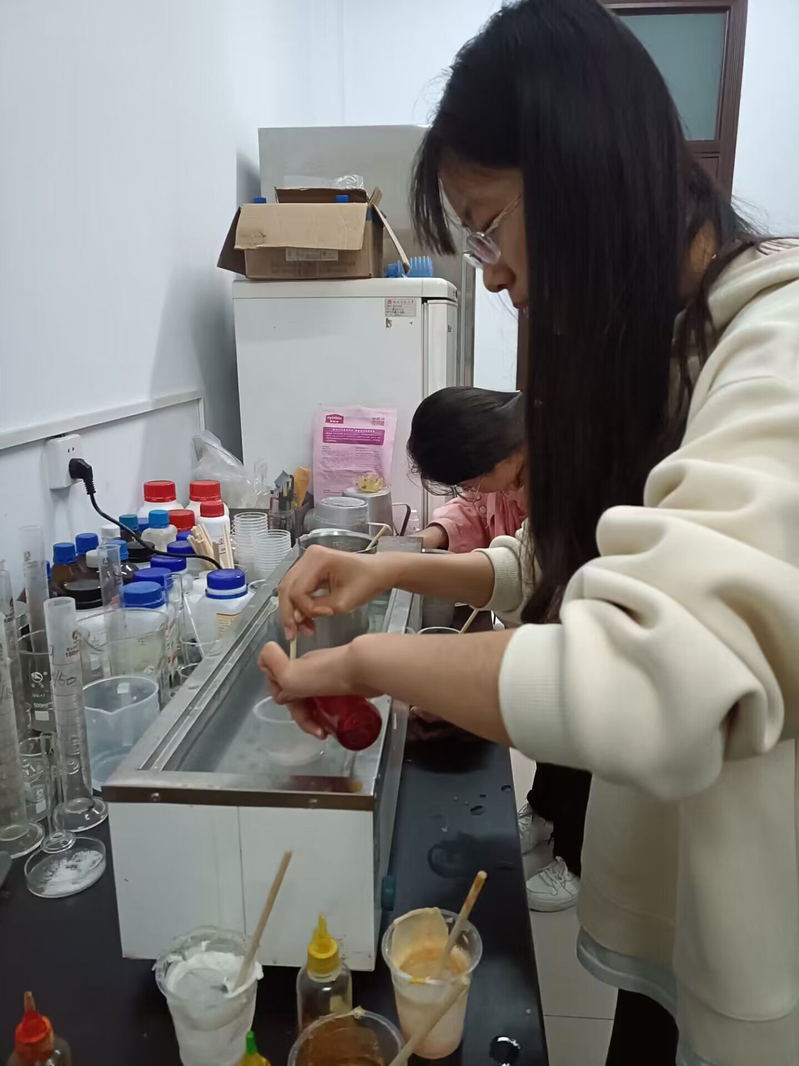 活动前期,化学创新社工作人员为同学们提前准备好实验服,将香精和颜料整齐排放,备齐制造手工皂所需物品。同学们需提前到达实验室,做好准备工作,穿好实验服。工作人员详细讲述手工皂制作的过程和注意事项,并为耐心地为同学们答疑解惑。活动期间,同学们在活动负责人的指导下,开始制作手工皂,先倒入适量的皂液,再选择是否加入遮光剂,然后按照喜好加入自己喜欢的颜料和香精后搅拌,搅拌充分后将皂液快速均匀倒入模具中,最终手工皂冷却后脱模,再用塑料薄膜包裹制作完成。活动结束后,同学们都兴高采烈地谈论着这次有意义的活动。其中,2021级本科生刘馨丹表示,通过亲自动手,独家定制出根据自己爱好,从而散发个人个性又健康的绿色产品,这既是一次开心而又独特的体验,又学到了手工皂的制作方法。