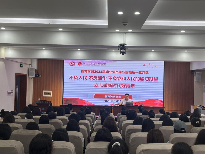 学部党委书记陈勇以“不负人民、不负韶华、不负党和国家的殷切希望,立志做新时代好青年”为题,分别从“有理想”是首要标准和立身之本、“敢担当”是时代要求和成才之要、“能吃苦”是坚毅品格和成长之基、“肯奋斗”是光荣传统和成就之源四个部分展开党课。毕业在即,他寄语党员同学们在新的学习工作岗位上要时刻牢记党的宗旨,不忘党员的光荣身份,自信自强,勤奋踏实,担当有为,争做新时代的党员先锋,成为报效国家、服务人民、奉献社会的时代新人。