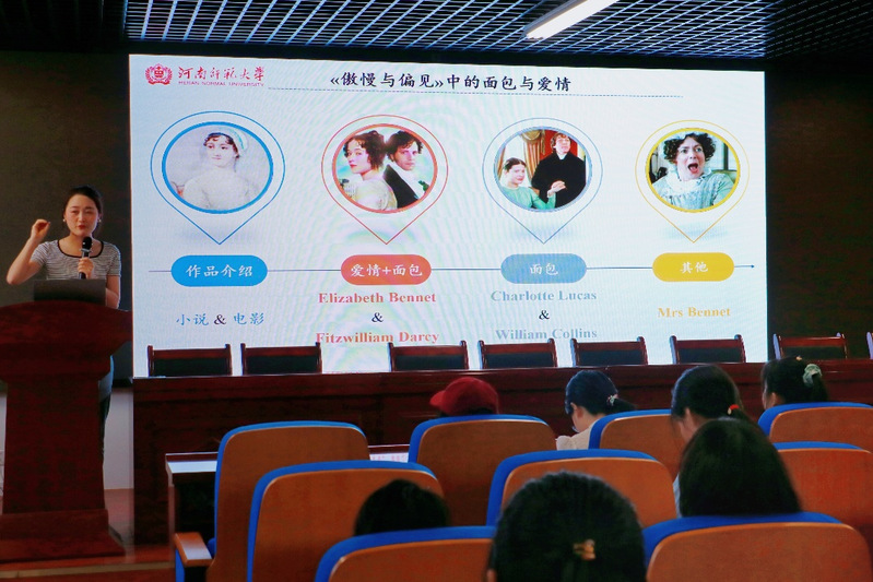 《傲慢与偏见》是英国著名女作家简奥斯汀的代表作,这部作品以日常生活为素材,一反当时社会上流行的伤感小说的内容和矫揉造作的写作方法作品描写傲慢的单身青年达西与偏见的二小姐伊丽莎白、富裕的单身贵族彬格莱与贤淑的大小姐吉英之间的感情纠葛。禹同欢从《傲慢与偏见》的作者,英国女小说家简•奥斯汀的创作背景——启蒙运动后期作为切入点,深入分析当时等级制度突出、女性处于不平等地位的时代背景。随后,她通过思维导图的方式理清主要人物之间的关系,帮助同学们更好了解书中的故事情节。这之后,禹同欢对小说人物描写片段进行摘录,从一个个细节描写以点到面地解构情节,从人性的独特视角分析小说人物的个性与特点。课堂尾声,同学们共同观看《傲慢与偏见》相关影视片段,直观感受小说中主人公们之间感情的历程。最后,禹同欢希望同学们要以书为镜,向“人间清醒夏洛特”学习,清醒地对自己生活中的面包与爱情做出取舍。