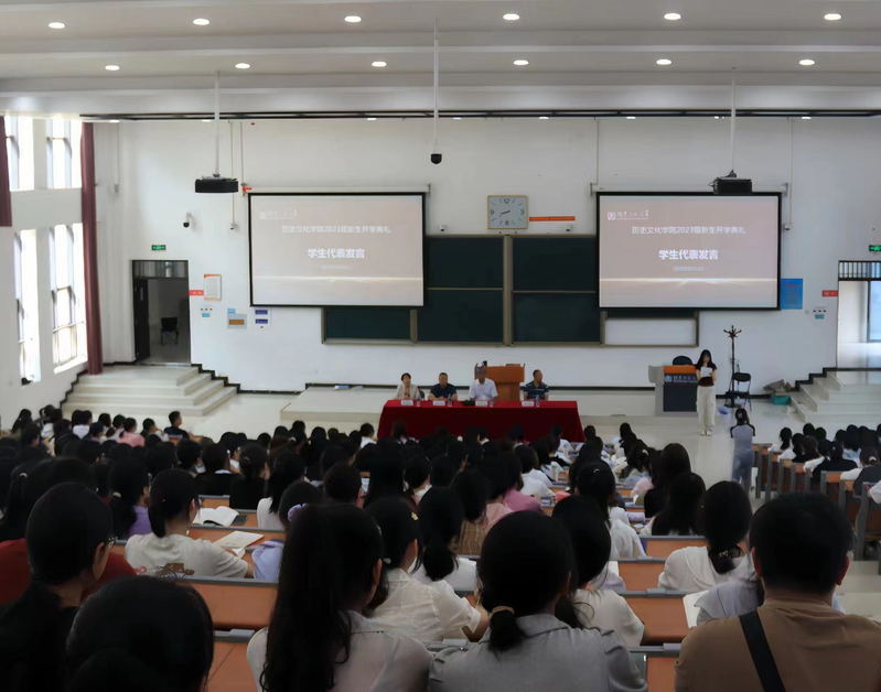 伴随着激昂庄严的国歌,开学典礼正式开始。会议伊始,院长苏全有对来自五湖四海的2023级全体新生表示热烈欢迎和诚挚问候,并就学院专业设置、学科建设、师资力量以及人才培养计划等方面向同学们作了简要介绍。他围绕“行己有耻,博学于文”的院训,勉励新生成为德才兼备的高素质人才,并鼓励同学们在师大百年的特殊时间点上努力学习,为历史学科做出自己的贡献。随后,党委副书记吴广飞强调2023级新生应为自己定位,发现自我,对自己负责,勇于担当,以实现自我。他激励同学们实事求是、实干肯干,重视身心健康,用丰富的心灵感受历史与现实,热爱生活、热爱生命。然后,本科生新生代表依次分享了选择历史的心路历程,以及对未来学习历史的殷殷期盼。在校生2021级学生代表分享大学生活的经验,帮助2023级新生更好适应大学生活。最后,2023级辅导员庞振康详细地讲述了《学生手册》的重要作用并对会议作总结发言,他鼓励同学们成为有担当的见证者、有深度的记录者、有大道的先知者,并祝愿学生遇见属于自己的美好世界。