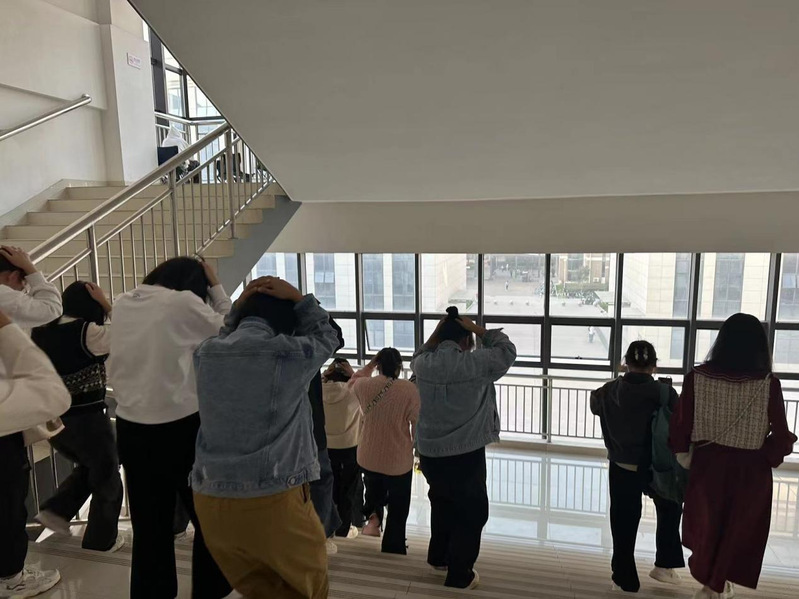 为确保演练活动安全、有效,学院遵循震时就近躲避、震后迅速撤离的原则制定了演练方案。演练前,各年级辅导员通过主题班会的形式对演练学生进行培训与讲解,明确了疏散流程与路线。上午9点40分,警报响起,演练学生迅速用双手保护头部,蹲在课桌旁进行紧急避险,等到疏散指令。9点43分,辅导员下达疏散指令,演练学生按照预定疏散路线,弯腰护头,紧张有序撤离教室,30秒的时间内到达指定集合点,随后辅导员迅速清点人数,确保演练人员全部到达,演练结束后又针对疏散过程中的不足进行进一步的完善,力图做到强化生命至上的人本意识,增强安全第一的责任意识。。