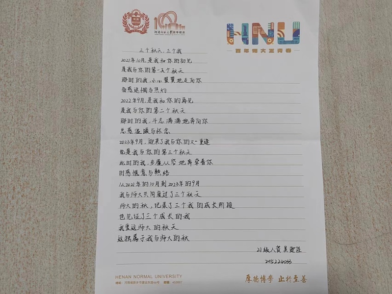 款款落笔绘金秋,深深诗情笼师大。此次诗歌活动为学院学生展现自我风采提供良好的平台,有助于进一步提升同学们思维创造力和文化素养,增强对师大的认同感与归属感。同时,也为学院精神文化建设及学生工作的顺利开展奠定重要基础。