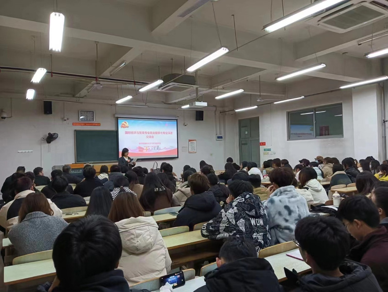 为提升国际经济与贸易专业学生的认知水平,明晰发展方向,助力个人规划,2023年11月29日晚,2021级、2022级和2023级国际经济与贸易班于求实西楼101教室召开就业前景与专业深造交流会。河南邦尼生物工程有限公司跨境运营主管陈学乾、河南河一工刀具有限公司董丽方及国际经济与贸易教研室丁祥生等教师参会。本次交流会由国际经济与贸易教研室主任侯明利主持。