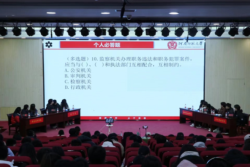 本次法律文化节分为“奋进师大新风采·法治春风伴我行”征文比赛、“百年师大新风采,崇法明律继开来”演讲赛、“明法杯”法治辩论赛、“铭法于心,学法力行”法治情景剧活动、“与法同行”法律知识竞赛、“法治讲堂”共六个环节。在“明法杯”法治辩论赛中,辩手们紧扣辩题本质,引用经典的开篇、心思细腻的反驳、层层下伏的攻辩,为观众带来一场法理、情理与智慧相结合的思想盛宴。复赛赛场,双方辩手以“中国应不应该实施普遍性的生育养育补贴”为辩题展开辩论,逻辑清晰,充分利用事实案例分析辩题,全面诠释己方观点,深刻揭示辩题本质,精彩的对决赢得阵阵掌声。“与法同行”法律知识竞赛包含必答题、抢答题和风险题三个部分,重在考察各组参赛队伍对法律知识的掌握程度以及解决法律问题的应变能力和思辨能力。激烈的比赛彰显参赛团队的默契配合和团结协作,展现参赛选手深厚的法律文化储备和灵活的应变能力。