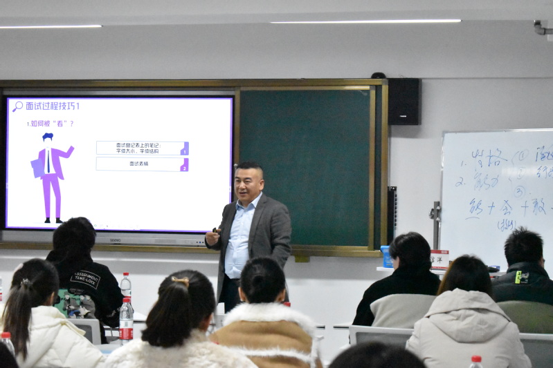 在培训会上,王信洋和高峰分别就面试技巧和职业素养两个方面进行深入地讲解与分享。王信洋结合自身的创业经历和管理经验,围绕面试技巧的重要性和同学们进行交流互动。他不仅分享了面试中的自我介绍、回答问题和提问环节的注意事项,还强调同学们应该通过有效的沟通和表达来展现自己的实力和价值。高峰从职业素养的角度出发,为同学们讲解如何在面试中展现自己的职业素养和专业能力。他提到职场礼仪、团队合作和问题解决能力等方面在职场面试的重要性,提出要通过细节和态度来体现个人的的职业素养。在培训会的互动环节,高峰模拟职场面试的环境,帮助同学提前熟悉职场面试的流程,他为每一组提供不同的课题,并针对同学们的回答给出实用的建议和指导。讲座结束后,同学们积极交流所学所想,并针对自己的问题与讲师进行探讨。通过本次培训讲座,相信同学们学到了丰富的面试相关知识和技巧,收获了满满的求职经验,并对自己的未来有了更加明确的认知与规划。
