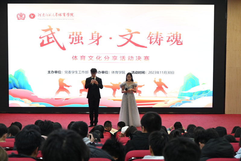 11月30日晚,河南师范大学第八届“阅享经典•书香师大”读书系列活动之“武强身·文铸魂”体育文化分享活动决赛在东校区思政平台举行。校党委组织部副部长王令耀、校党委学工部副部长蒋晋光、校团委副书记杨上上、体育学院党委副书记王芳、文学院刘志芳、体育学院司幸伟应邀出席并担任本次决赛的评委,各学院相关负责人、辅导员和学生代表共同参加此次活动。