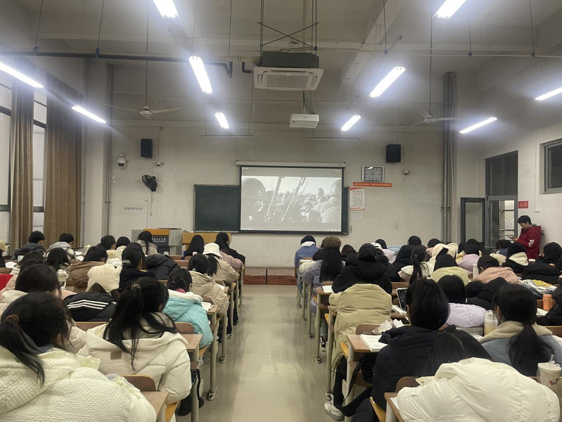 观影活动前,全体师生起立奏唱国歌,辅导员带领同学们为所有遇难者和革命先烈进行一分钟默哀仪式。电影观看结束后,同学们为先辈们向死而生、誓死拼搏的革命斗争精神所感动,也为身处那个时代的人们身不由己、家破人亡所悲痛,更为泯灭人性、丧心病狂的侵略者所愤怒。
