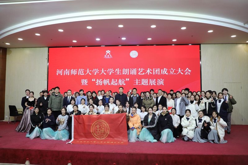 以声音传颂经典,用情感丰富青春。12月25日晚,由文学院主办的河南师范大学大学生朗诵艺术团成立大会暨“扬帆启航”主题展演在求是东楼思政平台举行。学校和学院相关负责人及200余名师生共同观看了主题展演。