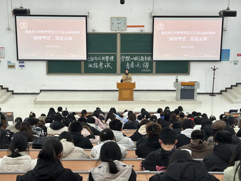 为激发学生期末学习动力、营造诚信考试的氛围,12月26日下午,政治与公共管理学院在文昌楼127室举办“诚信考试,青春无悔”2023级主题年级会,2023级专兼职辅导员及全体学生参与其中。