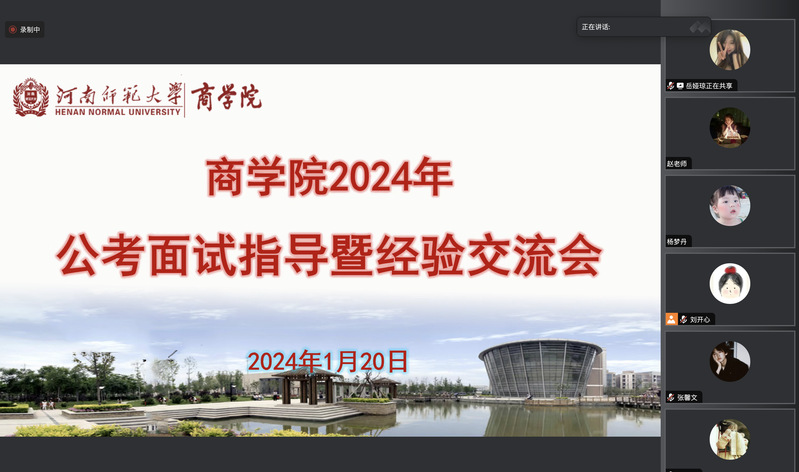 为全力做好就业工作精准帮扶,帮助学院2024届毕业生中通过国家公务员考试笔试的同学做好面试准备,增强考生备考信心,1月20日中午,商学院于线上举行2024年公考面试指导暨经验交流会。本次会议特邀三位2023届考公上岸的毕业生交流分享面试经验,学院20余名国考进面的本硕毕业生参加,会议由2020级辅导员赵玮主持。