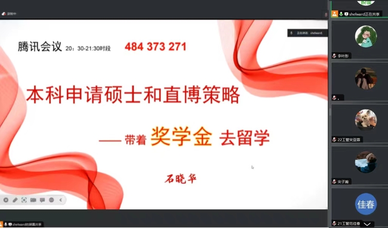 为拓宽学生国际视野,助力学生学业发展,提高升学质量,1月29日晚,商学院于线上举办本科生留学深造经验分享会。会议特邀商学院教师石晓华进行主持宣讲,学院学生踊跃参加。