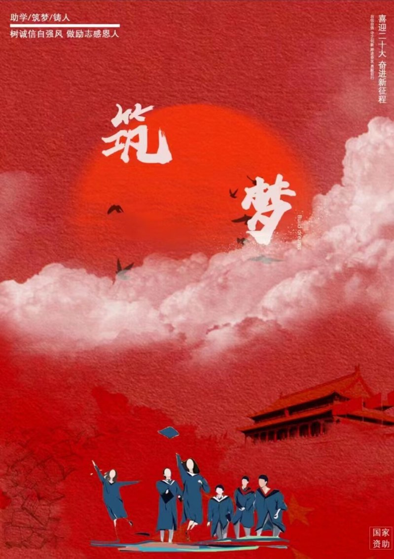 大赛分为作品征集和作品评选两个环节,在作品征集环节中,同学们围绕“树诚信自强风,做励志感恩人”主题,充分发挥想象力和创造力,将思想性,艺术性与传播性相统一,创作出多姿多彩、贴合主题的优秀作品。平面类作品色彩鲜明,图文并茂,展现出莘莘学子的求学之志与感恩之心;视频类作品寓意深刻,画面灵动,传递出国家资助学生成就梦想的脉脉温情。在作品评选环节中,老师们秉持公平原则,严格筛选,最终评选出一系列优秀作品。其中2021级苗梦洁运用写意手法创作出海报作品《筑梦》,作品以希望之红为底、云端朝阳为景,构图简洁,意蕴丰富,勾勒出学子放飞梦想、筑梦华夏的画面,蕴含着青年学子坚定的理想信念、深厚的家国情怀、强烈的责任担当。2022级胡靖的视频展现河南师范大学校内的四季景象,彰显师大学子积极昂扬的精神风貌,画面温馨,言语温暖,表达出对学生的美好祝愿与殷切期盼,希望学生砥砺前行、圆梦未来。