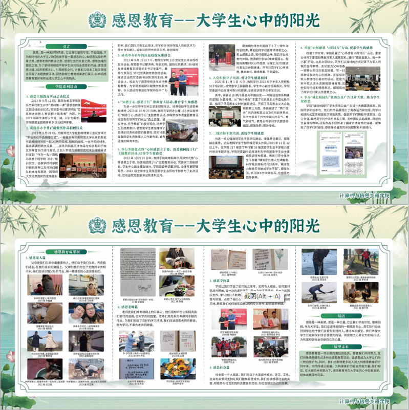 为加强对学生的思想引领、创新思想政治教育的途径与方法,帮助学生深刻领会感恩的内涵,激发感恩之情、培养感恩之心、引导感恩之行,计算机与信息工程学院举行感恩主题教育成果展,以展板、易拉宝、电子海报、微信公众号推文等多种形式,将学院前期开展的系列主题活动及成果进行展示总结及宣传。通过线上与线下相结合,营造育德和育心相结合的教育引导氛围。