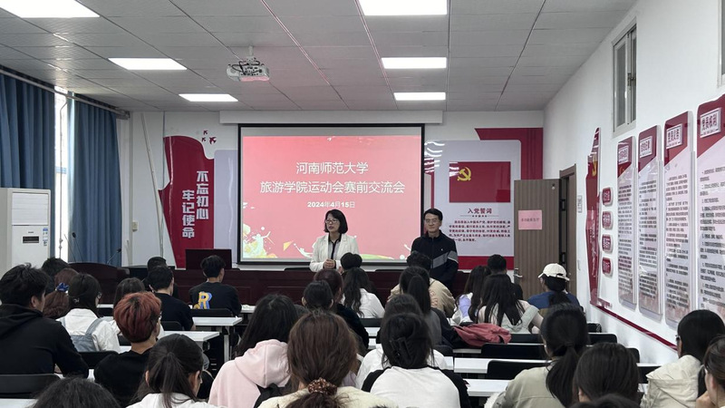4月15日,旅游学院在琢玉楼多功能报告厅组织开展河南师范大学第六十一届运动会参赛运动员赛前慰问交流会。旅游学院党委副书记翟方、团委负责老师出席会议并慰问全体运动员。