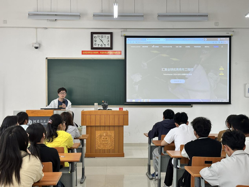 宣讲会上,车高峰为在场的学生们详细介绍了机器人大赛的历史背景、比赛规则以及参赛要求。他通过生动的案例和丰富的实践经验,让学生们对机器人大赛有了更加直观和深入的了解。同时,车高峰还分享了一些备赛技巧和策略,鼓励学生们积极参与,勇创佳绩。随后,车高峰进行了现场展示,他熟练地操控机器人进行快速前进、精准转弯、目标识别、精准打击等一系列复杂的动作,让学生们惊叹不已,赢得了阵阵掌声。在展示过程中,车高峰还详细介绍了机器人的工作原理和技术特点,让学生们对机器人技术有了更加深入地了解。宣讲会最后,车高峰为现场的学生们进行了答疑环节。学生们积极提问,就比赛细节、技术要求等方面的问题进行了深入交流。