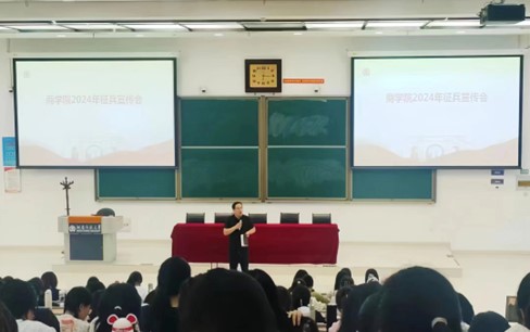 为进一步做好征兵宣传与国防教育工作,引导有志青年参军报国,弘扬爱国主义主旋律,5月12日,商学院于文昌楼127教室举办2024年征兵宣讲会。学院相关负责人和2020级全体学生参加本次活动,宣讲会由商学院团委书记郭琛昊主持。