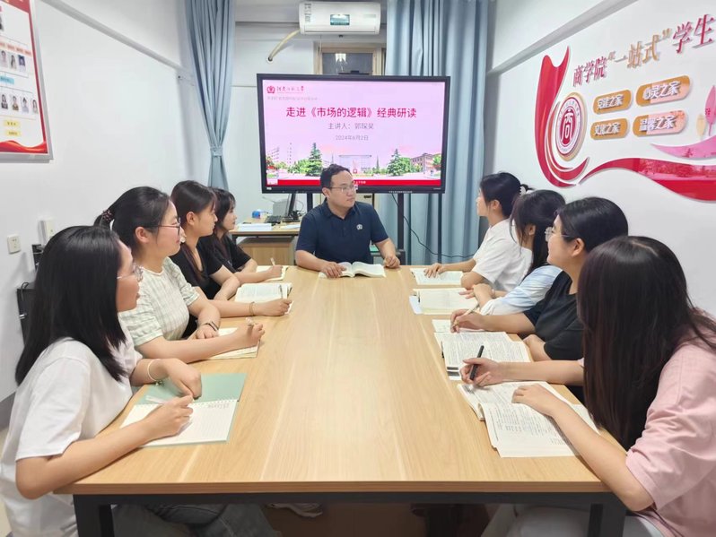 本次活动围绕交流分享、经典研读两个环节开展。在交流分享环节中,同学们从自身阅读感悟出发,畅谈对《市场的逻辑》一书的独特理解。2023级会计学专业樊美淇聚焦于市场机制的精妙运作,探讨企业社会责任对市场制度的深远影响;2023级经济学专业曹仕霖深入挖掘垄断企业与劳动者、消费者之间的关系,揭示经济现象背后深层次逻辑。学院学子以专业见解,呈现出市场经济的丰富世界,引发对市场运作和发展规律的深度思考。在经典研读环节中,商学院团委负责人郭琛昊深入解读《市场的逻辑》,从逻辑、平等性和现实约束等多维度分析市场,强调市场机制在资源配置中的核心作用。他表明企业应秉持公平与可持续发展理念,推动社会和谐,并结合中国国情,探讨渐进式改革与产权变革对经济发展的深远影响,激励学生积极投身经济发展,贡献智慧和力量。最后,郭琛昊与学生围绕学习效率提升、考研就业抉择、全国性竞赛备赛等议题进行拓展交流,共话经济智慧,展望未来发展。