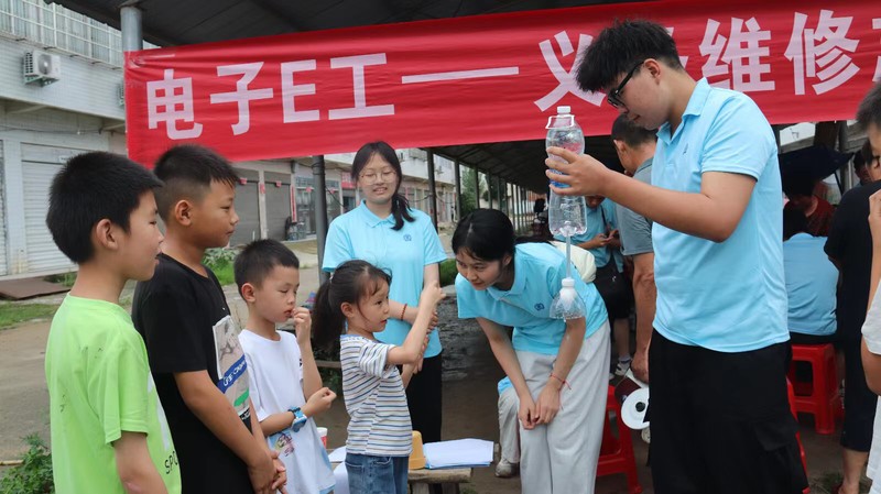 为提高乡村儿童的科学素养和创新能力,激发乡村学生对科学的兴趣和好奇心,鼓励“三下乡”社会实践活动调研团将所学知识用于实际,在实践中长真知、谱新篇,7月12日,在学院党委副书记邓晓刚和团委书记付康康的带领下,电子与电气工程学院“电子E工一义务维修、科普志愿服务团奔赴信阳白雀园镇光山县双轮村,开展科普实验活动。