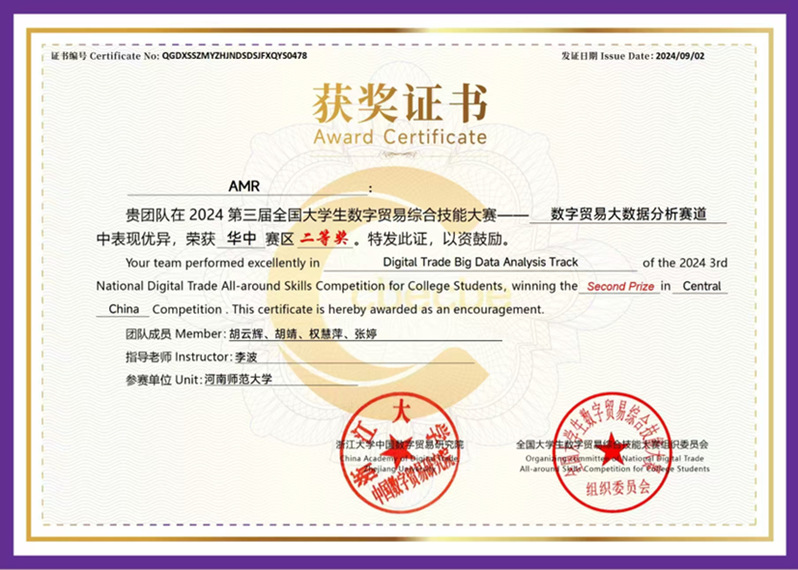 数据比拼展才华,智慧碰撞映风采。此次获奖不仅是对AMR团队自身能力的肯定,也是对学院在数字贸易领域教育成果的认可。本次比赛有利于激励更多学子投身数字贸易领域的学习和研究,助推数字贸易领域的人才培养和创新发展。今后,商学院将继续深化数字贸易教育教学改革,培养出更多优秀的数字贸易人才。