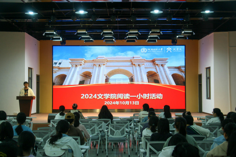 活动开始,2024级汉语言文学专业学生代表王帅博与崔新易上台分享好书。王帅博分享了对《毛泽东选集》第一卷的理解,表示《毛泽东选集》是当代青年追求信仰的重要指南,毛泽东精神仍在当代青年身上流动,激励青年学生学习伟人思想,争做新时代青年,引发在座学生共鸣。崔新易分享了自己对《百年孤独》的感悟,以“破译”为主题从拉美文明联系到中国历史,强调了历史和文化对一个民族的重要性,以加深学生对于书籍的理解。分享环节结束后,全场学生共同参与了一小时的沉浸式阅读,放下手机,回归纸质阅读,与书香同行,与良友为伴。