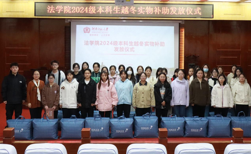 寒冬送真情,关怀暖人心。为减轻家庭经济困难新生经济负担,提升资助育人实效,11月5日下午,法学院在模拟法庭举行2024级本科生越冬实物补助发放仪式。学院党委副书记田月红、2024级本科生专兼职辅导员王亚楠、杨晨及受资助学生参加此次活动。