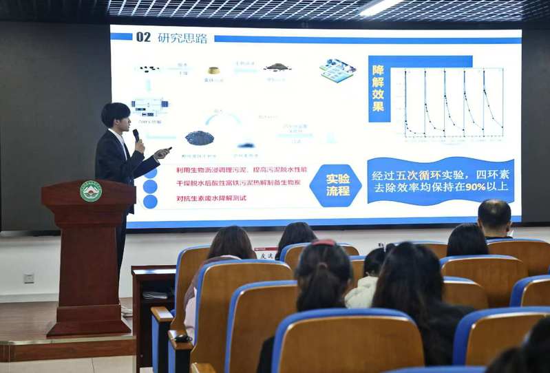 本次竞赛吸引了来自环境学院各年级的众多学生积极参与,共收到参赛作品11件,内容涵盖自然科学论文、科技发明制作两大版块,涉及污水处理、大气污染治理、固体废弃物资源化利用、生态修复等多个领域。比赛分为展示汇报、自由问答两部分,其中团队陈述5分钟、答辩2分钟。评委老师根据文本内容、现场汇报及答辩情况进行综合评审。比赛过程中,各团队依次上台从团队项目创新设计理念出发,结合PPT所呈现的科研成果、优势特色、社会意义等方面全方面展示作品等方面向评委及观众展示其计划的实用价值、科学性及创新意义。在问答环节中,评委们针对作品中的问题进行提问,与参赛队伍深入互动,现场交流氛围热烈。