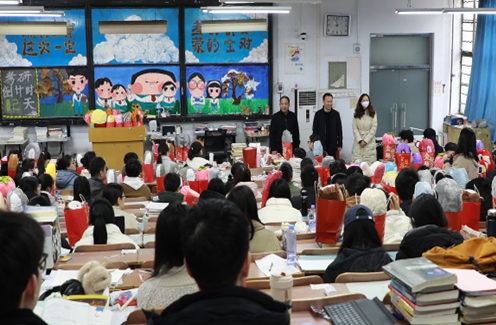 伴随着《一路生花》《好运来》的欢快歌声,同学们有序入座。活动现场,学院领导老师与考研学子亲切交谈,细致了解学生们的备考情况和身心状态。学院党委书记陈明银代表学院全体教师对考研学子刻苦学习、坚持不懈的学习态度给予肯定和表扬。同时,陈书记结合学院往年考研情况,从信心、坚持和方法等方面悉心嘱咐同学们,要在拼搏奋斗的基础上,坚定信念,以最好的状态迎接考试。随后,在场各位领导老师为同学们冲刺阶段的复习提供了实用的策略,鼓励学生在最后30天的关键时期,坚定目标,劳逸结合,提升学习效率。最后,领导老师们亲手将满载着深情厚意的“考研大礼包”送到了同学的手中。从寓意“高枕无忧”的暖心抱枕,到象征“梦想成真”的定制钥匙扣;从代表着“心想事成”的甜美果橙,到“福运旺旺”的旺仔牛奶;从寓意“巧克难题”的巧克力,到“力量加倍”的奥利奥饼干;再到意味着“榜上有名”的棒棒糖,以及“非你莫属”的薯愿,每一份都承载着深厚的关怀与祝愿,如冬日暖阳般温暖着同学们。