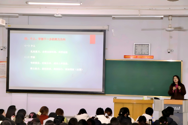 会议伊始,教育学部副部长卜彩丽围绕考研的必要性与重要性作动员讲话。她结合当前就业形势与教育行业发展趋势,强调考研不仅是提升个人专业素养的重要途径,也是增强未来竞争力的有效方式。鼓励同学们尽早确立目标、科学规划时间、坚定备考信心。接着小学教育班主任牛超、教育技术学班主任师亚飞、学前教育班主任李娜、心理学班主任袁璐一、教育学班主任夏豪杰依次发言,分别就各专业考研初试科目、院校选择、备考策略、复习资源等方面进行详细介绍,为同学们提供了具有专业特色的备考建议。最后,教育学部党委副书记翟方结合近年来学部学生考研考公整体情况,向同学们介绍了考研考公上岸率、院校分布、录取趋势等内容。她鼓励同学们向优秀学长学姐学习经验,向老师寻求帮助,合理安排复习节奏,并强调学部将持续为考研学生提供政策支持与学习资源保障。