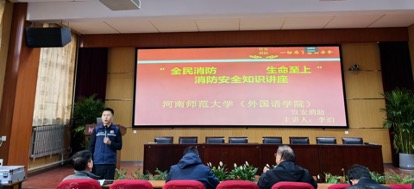 为深入贯彻落实习近平总书记关于安全生产和消防安全的重要指示精神,扎实开展我校2024年度“119”消防宣传月系列活动,提升师生的消防安全意识和自防自救能力,11月26日外国语学院特邀河南宣安消防技术服务中心李泊讲师在学院报告厅举办了一场题为“全民消防、生命至上”的消防安全知识讲座,随后进行了灭火实操演练,全院教职工及部分学生参与。