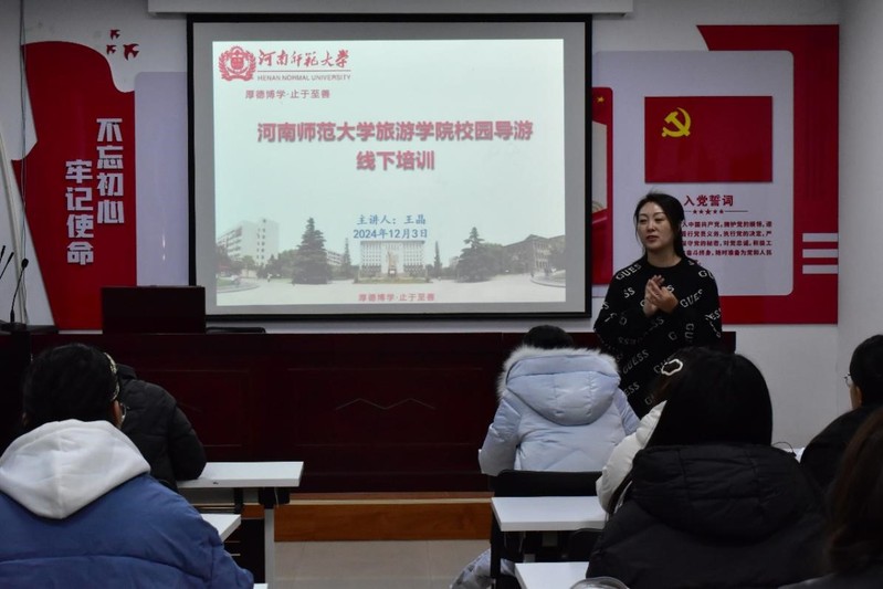 为提升校园导游团队综合能力,丰富校园文化建设,12月3日下午,旅游学院于琢玉楼多功能报告厅举办校园导游培训。学院专业教师王晶担任培训师,来自全校各学院40名同学参加培训。本次培训会由学院团委负责人张志明主持。