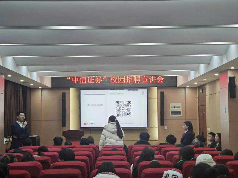 为提升学生专业技能,促进学院与企业创新需求协同发展,12月29日下午,商学院于学院119报告厅举行“访企拓岗促就业”宣讲会,中信证券新乡分公司莅临学院交流。商学院党委副书记马淑明、团委副书记郭琛昊以及2025级部分毕业生参加本次会议。