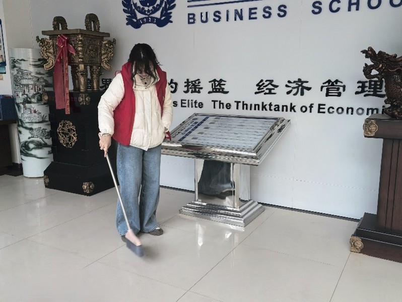 活动伊始,负责人有序组织,合理分工,明确安排各个学生的任务。随后,同学们各司其职,干劲十足,以饱满的热情投入清扫活动,展现出积极向上的精神风貌。在学院大厅内,同学们针对地面、台阶以及楼梯口的灰尘、碎屑进行重点清理,他们手持扫帚、弯腰苦干,使学院环境焕然一新。同时,同学们齐心协力,将学院门口的车辆规范有序地摆放到指定停车区域,有效维护校园交通秩序,保障师生通行安全便捷。在学生工作办公室内,同学们对桌面杂物进行精心分类摆放,有序陈列书籍材料,并对室内死角进行全方位清扫整理,共同打造整洁舒适的工作环境。活动结束后,2024级工商管理专业陈思琪感慨道:“此次活动深化了我对劳动精神和团结意识的认识,帮助我以更加积极向上的状态步入新学期,迎接新挑战。”