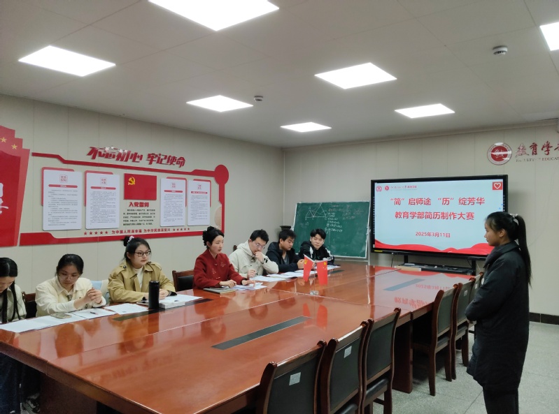 为帮助学生提高简历设计水平,制作出与目标岗位契合度更高的简历,3月11日,教育学部在田家炳807会议室举办主题为“简”启师途、“历”绽芳华的简历制作大赛。学部专兼职辅导员担任评委,毕业班学生参加比赛。