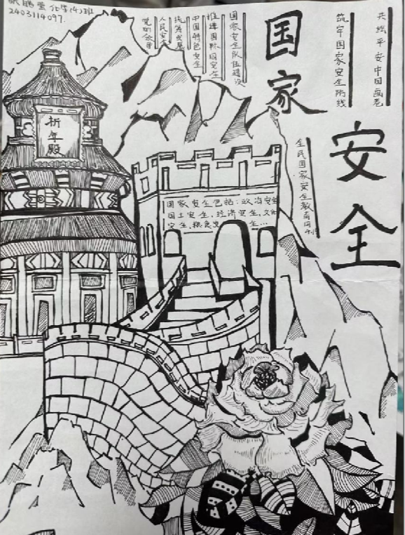 本次活动采用“艺术+思政”教育模式,设置手抄报、书法、绘画三大创作赛道,聚焦新时代国家安全成就主题。本次活动共收到参赛作品100余件,参赛作品立意新颖、视角独特,充分展现当代大学生心系家国的责任担当与积极向上的精神风貌。作品内容紧密契合当前国家安全形势与经济社会发展热点,生动展现近些年来国家安全工作的历史性变革,深刻诠释总体国家安全观的丰富内涵。参赛学生表示,通过创作加深了对非传统安全知识的理解,未来将把维护国家安全融入专业学习与实践。