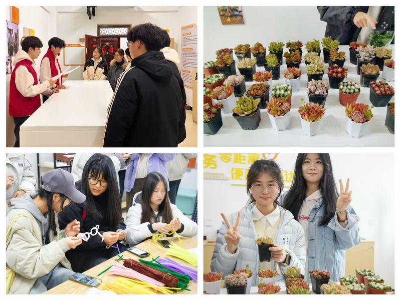 活动伊始,“植树微课堂”在生活服务站126室热烈开讲。由“红色指针”党员先锋牵头,围绕植树节由来、树木生态价值及“双碳”目标下的青年责任等议题,开展趣味知识问答。党员先锋结合历史典故与当代案例生动讲解,并发出“绿色代码”倡议。同步在逸趣坊123室,“创意造林”扭扭棒DIY专区热闹开启。同学们发挥创意,将普通扭扭棒化作生机勃勃的叶片与小花,制作成专属绿植造型。大家用这些满载心意的手工作品“领养”真实盆栽,为其佩戴独一无二的“节日勋章”。这一环节巧妙将手工劳动的乐趣与绿植养护的长期责任相连,让同学们在“手作一株绿”的过程中,切身感受“种下希望、守护生命”的节日情怀,打造属于自己的“绿色伙伴”。