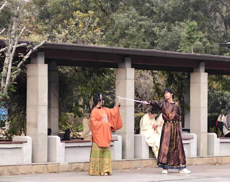 汉服体验活动在东12“一站式”学生社区举办。活动开始前,负责人精心策划细节,提前建好群聊并通过发收集表来收集参与同学的尺码与偏好,确保服饰合身。还邀请社内工作人员担任妆造师,为参与同学绾起青丝——从分缝、编发、盘绕到插簪固定,一步步将现代发型梳成贴合汉服形制的古典发髻;并描黛眉、点绛唇、搭配簪花和团扇等配饰,让大家直观感受“衣冠上国”的服饰美学。活动开始后,同学们身着宋制或明制服饰沿情人湖漫步,衣袂随风轻扬,与亭台水榭相映成趣。在工作人员的指导下,大家模仿古籍中的礼仪姿势,或凭栏远眺,或执扇浅笑,用镜头定格“步步生莲”的古典意境。现场还设置投壶活动,同学们手持箭矢站在三尺外,尝试将其投入仿古铜壶中,欢声笑语间重现古人“宴饮投壶”的生活雅趣。