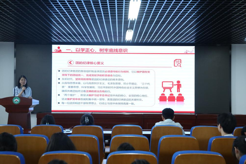 会上,刘敏从以学正心、树牢底线意识,以案为鉴、保持敬畏之心,以责正身、坚守青春担当三个方面,带领大家学习了《中国共产主义青年团纪律处分条例(试行)》的重点内容。她结合大学生常见的违纪违法案例,详细讲解了纪律建设的重要性、团的纪律核心要义、处分类型及影响和违纪行为与对应处分。她鼓励同学们要以案为鉴、警钟长鸣,将纪法意识内化于心、外化于行,真正让纪法成为青春远航的压舱石。